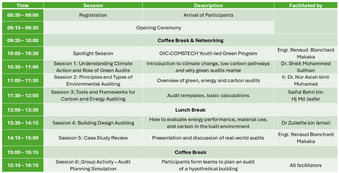 Green Audits: Pathways to a Low-Carbon Future, Part 1 is a capacity-building workshop designed to equip participants with the knowledge, skills, and tools required to carry out effective green and carbon audits. The workshop is jointly organised by the Standing Committee for Scientific and Technological Cooperation (COMSTECH) of the Organisation of the Islamic Cooperation (OIC) and the Centre for Green Technology and Sustainability Research (GreenTeXS) at Universiti Teknologi Brunei (UTB), under the UTB-STE Connect 2025 congress event. This two-day programme aims to develop participants’ competency in environmental auditing, enabling them to apply their skills to reduce greenhouse gas emissions in their homes, workplaces, or institutions.
